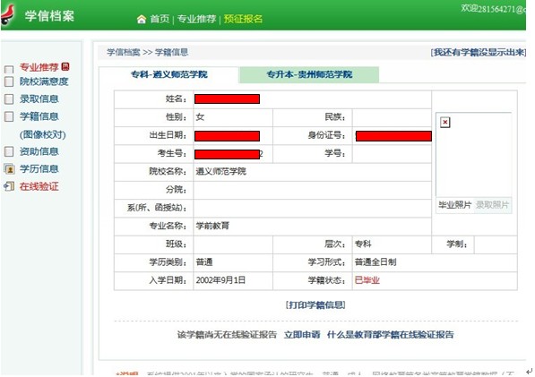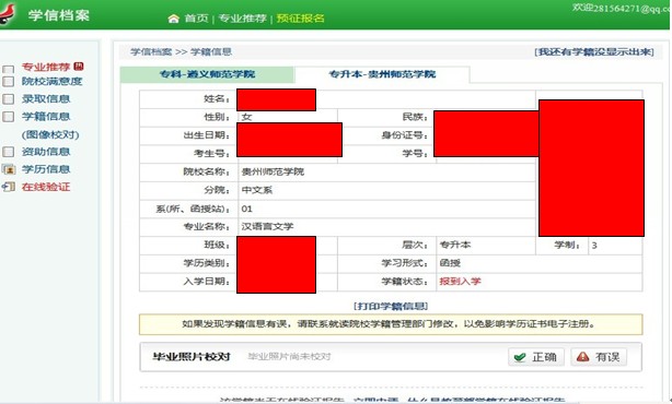 11、这里注意:点击“专升本-贵州师范学院”。 提示:红色标记为保密别人信息,无其他意义。