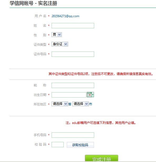 7、输入你的真实姓名、真实身份证号、你的手机号码。如实填上其他信息,点击下方的“获取效验码”。学信网会发短信在你的手机上,输入手机上给你的效验码后,点击“完成注册”。