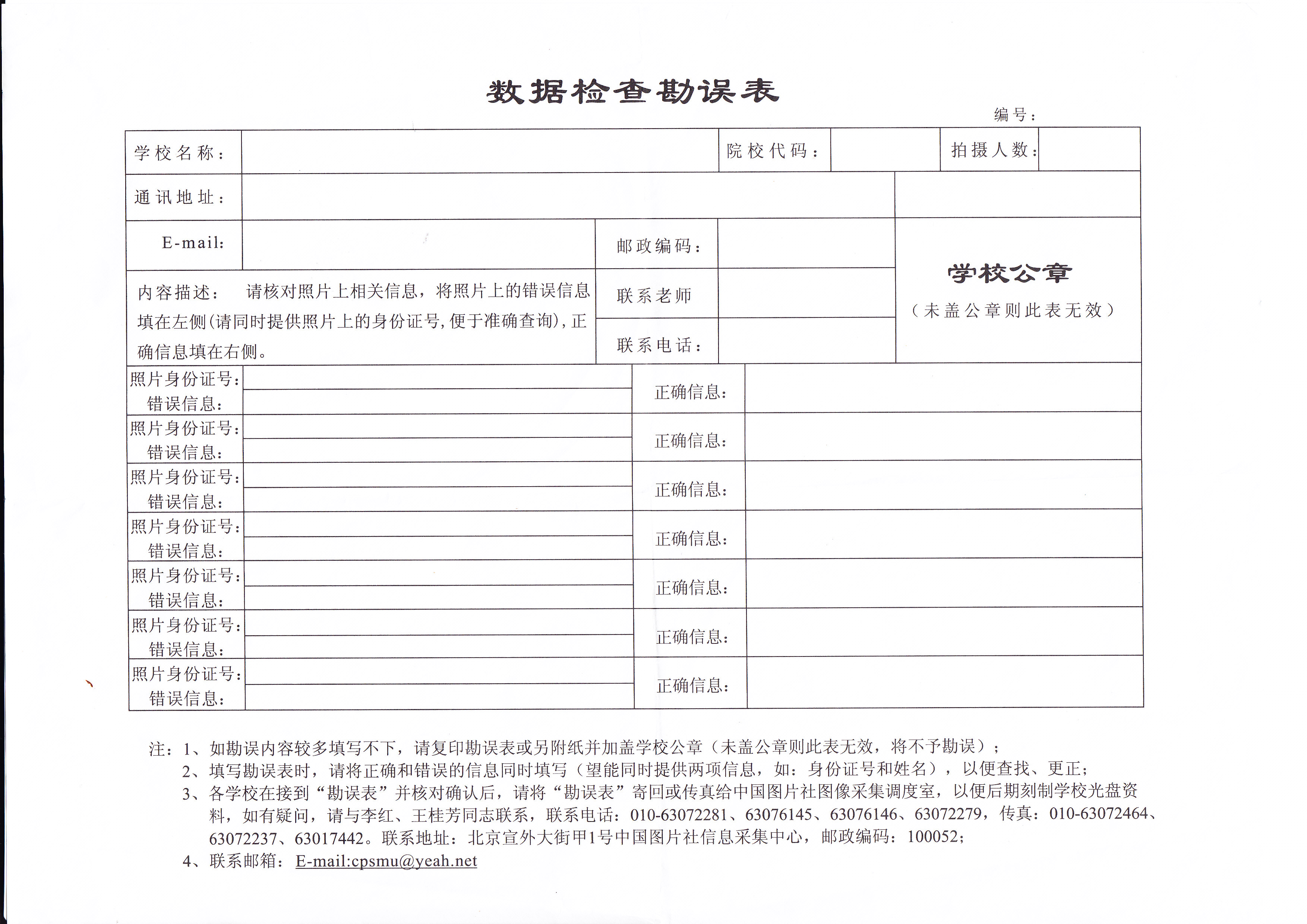 在核对过程中,如果电子图片上出现的信息有误,学生自行在网上进行修改并提交;如信息有误不能进行修改的,尽快与学生所在各教学学院、函授站(点)联系。院内学生由各学院填写后,交继续教育学院成教部统一上报。各函授站(点)要按照正确信息及时填写《摄像数据检查勘误表》,并交由“新华图片社贵州分社”修改。